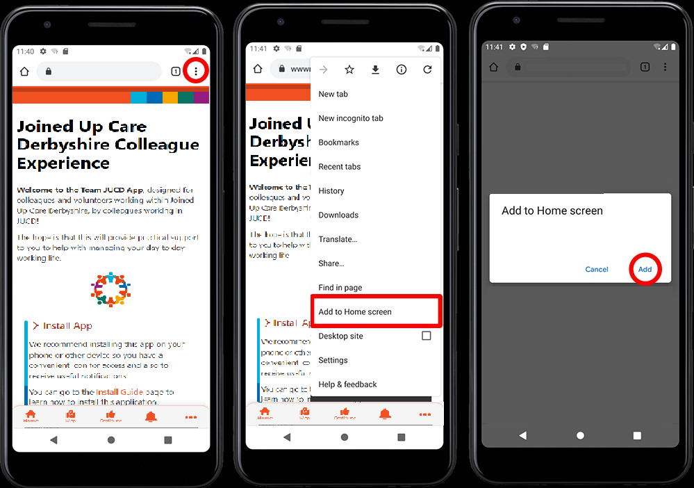 Navigate to this website in your Chrome browser. You can then click the Settings icon (three dots) on the top right of your browser window and select "Add to Home screen". Your browser may have automatically asked you to add this site to your home screen. If that is the case, and you accepted and the JUCD icon is amongst your apps, you don't need to do anything else.