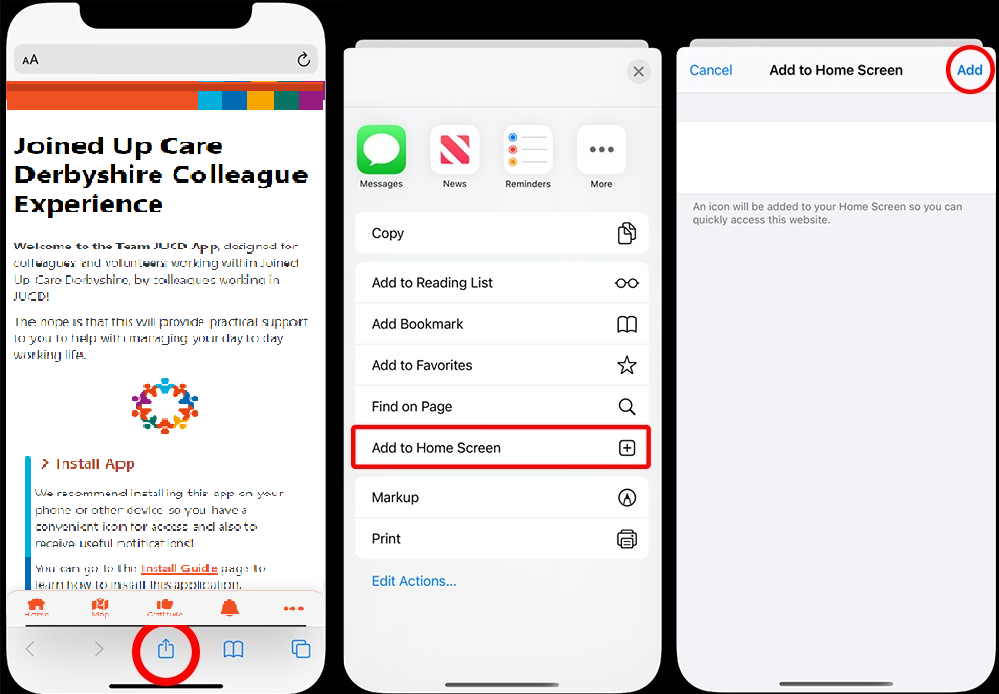 Navigate to this website in Safari (you will have done this already if you are on this page). Press the Share button at the bottom and then hit "Add to Home Screen" and then on the next screen hit Add.